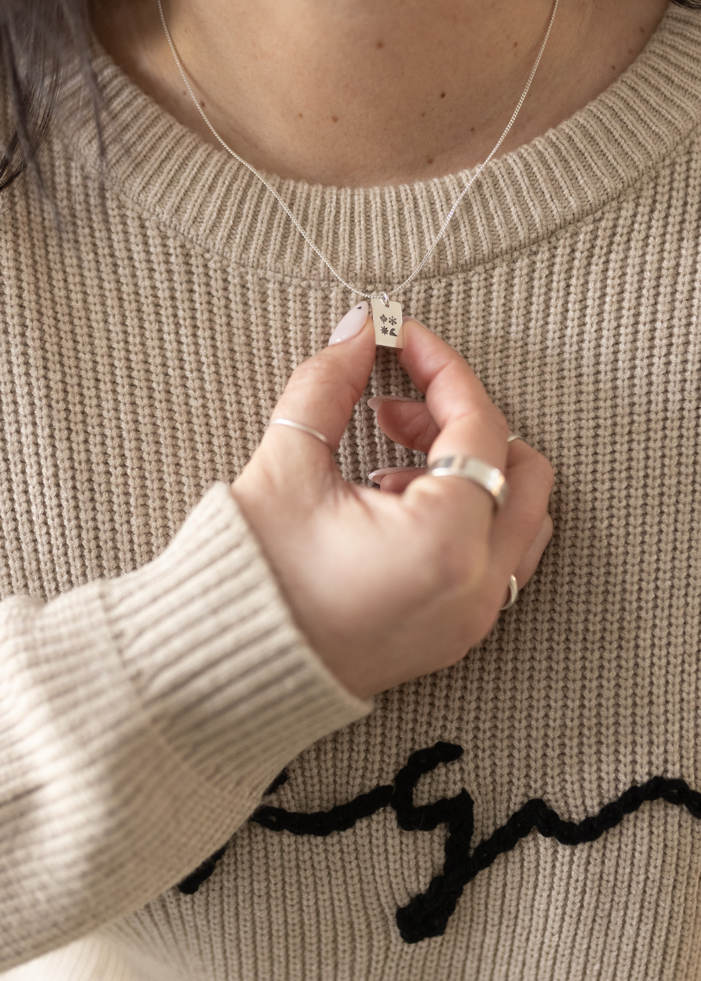 Hand embroidered by our friend Ashley at Ollie & Co., this knit represents the joy we share in building this community along with YOU.